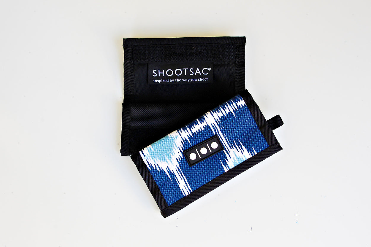 Each wallet is made from a decorative fabric that matches a Shootsac cover that fits the Shootsac Lens Bag and the HipSkip Laptop Sleeve.